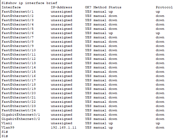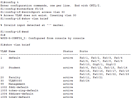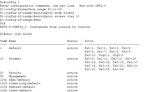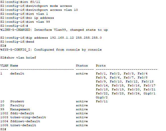 My first step after setting up the switches and cabling, and setting the IP addresses on the PC’s and the default VLAN, was to configure the VLAN settings. First S1: